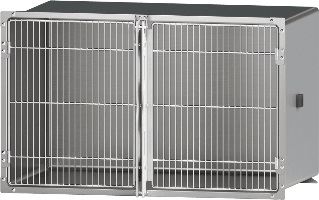 Cage en acier inoxydable à double porte, durable et facile à entretenir. Options de porte grillagée ou en polycarbonate transparent pour limiter les risques de contamination.